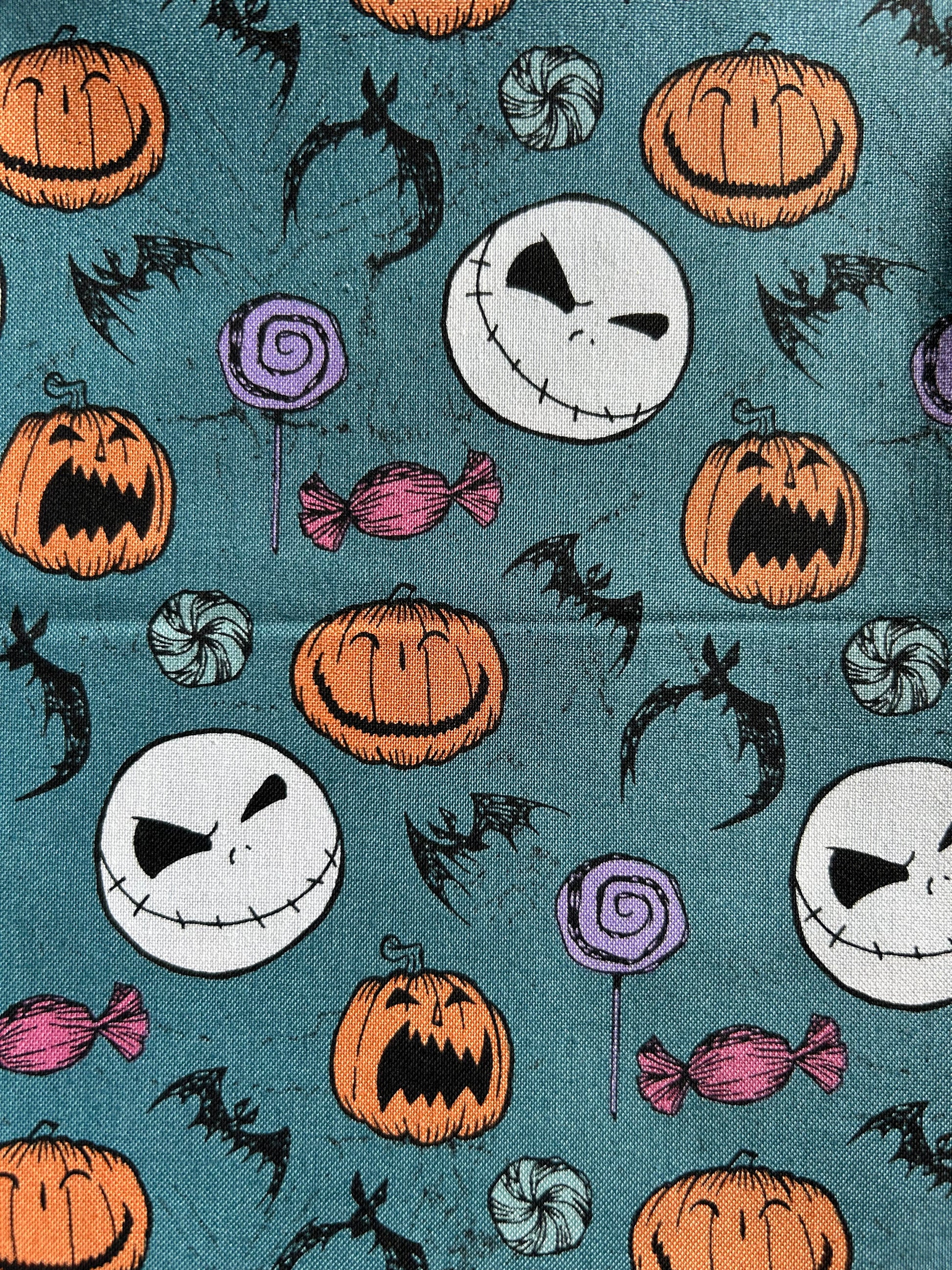 Blue scrunchie with Jack Skellington, pumping and candy print with light purple ribbed tag.