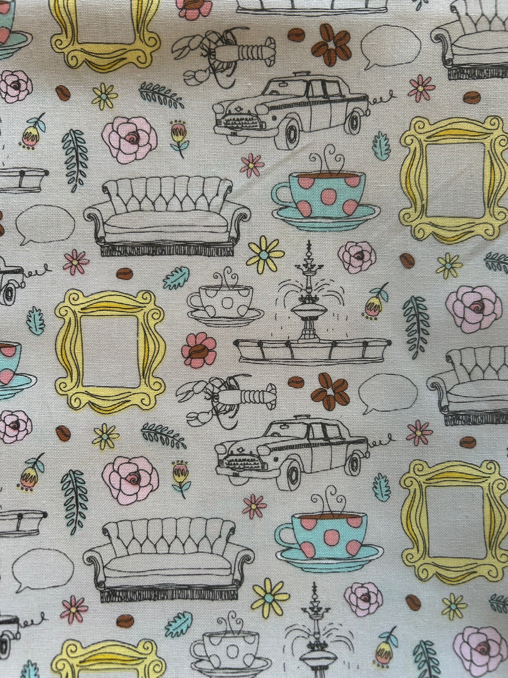 White scrunchie with FRIENDS doodle prints and black ribbed tag