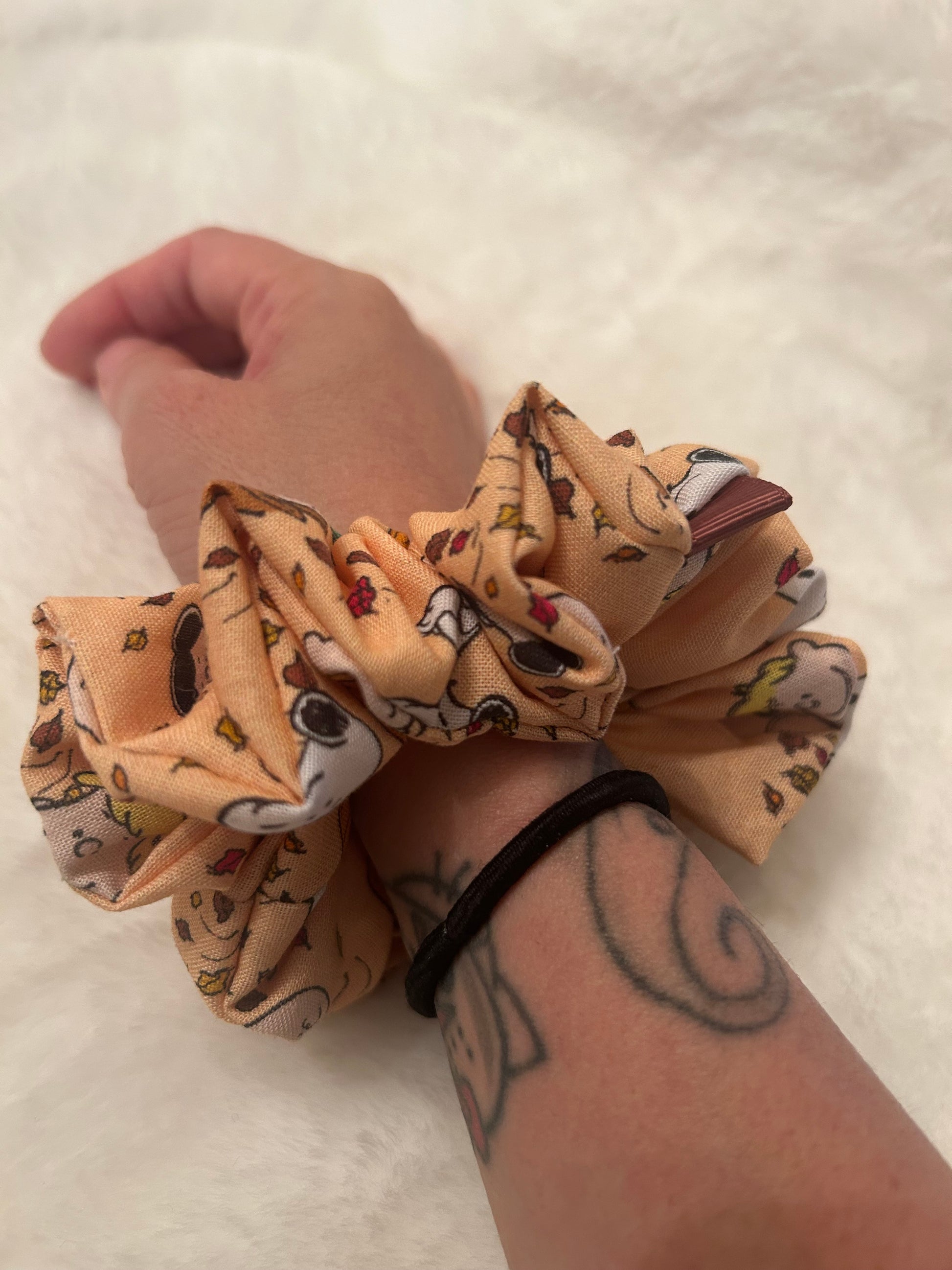 Light Orange scrunchie with fall Charlie Brown print and dark brown ribbed tag.