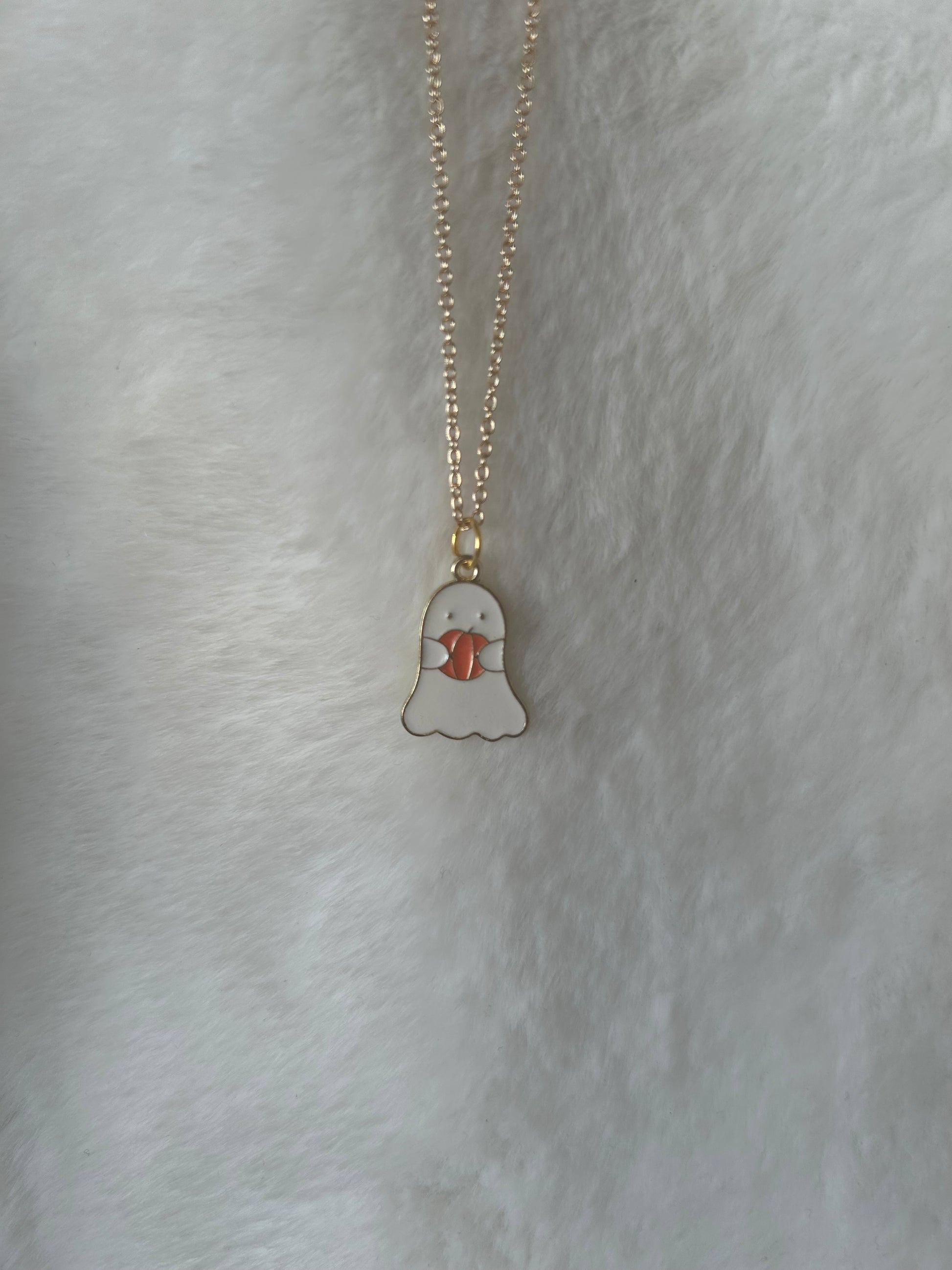 Ghost holding pumpkin enamel charm on gold colored chain.