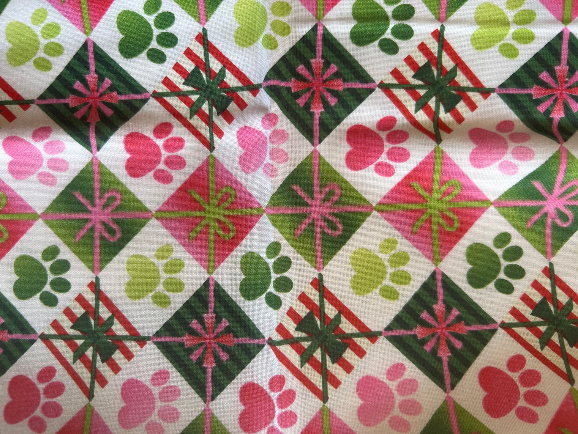 Paw print Christmas scrunchie with gold dog bone tag .