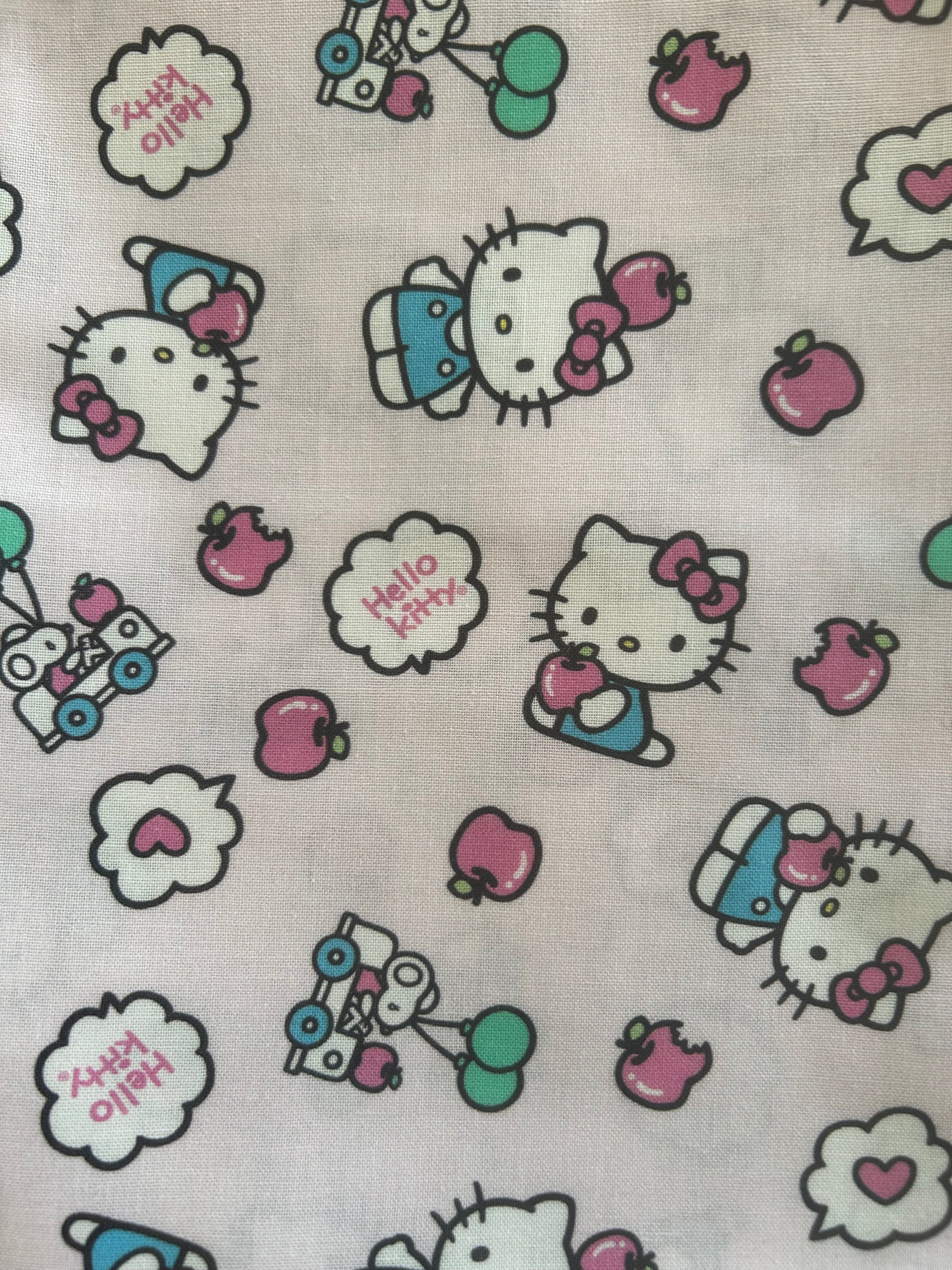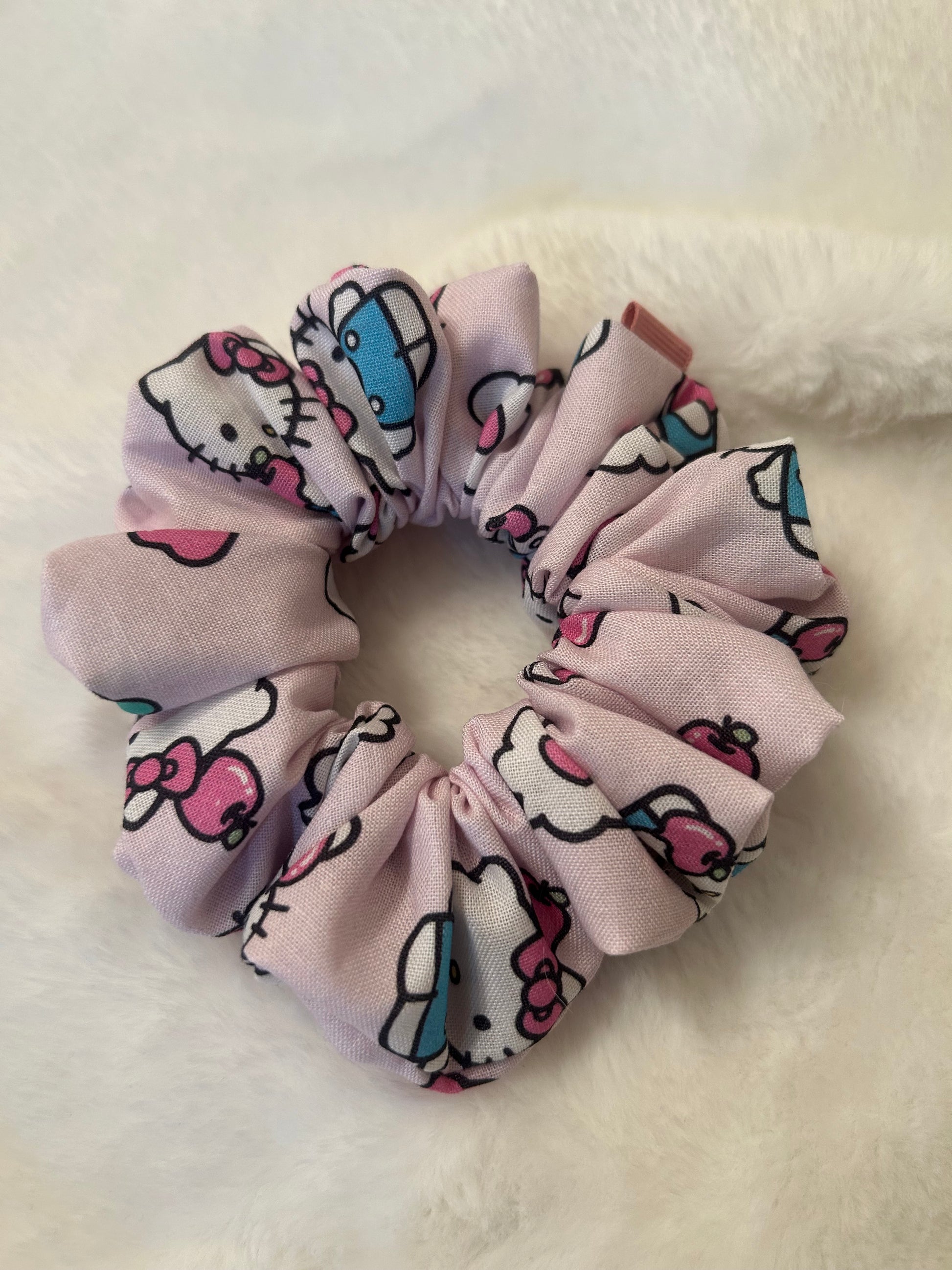 Pink scrunchie with hello kitty, ballon and apple print with black ribbed tag, blue ribbed tag or pink ribbed tag.