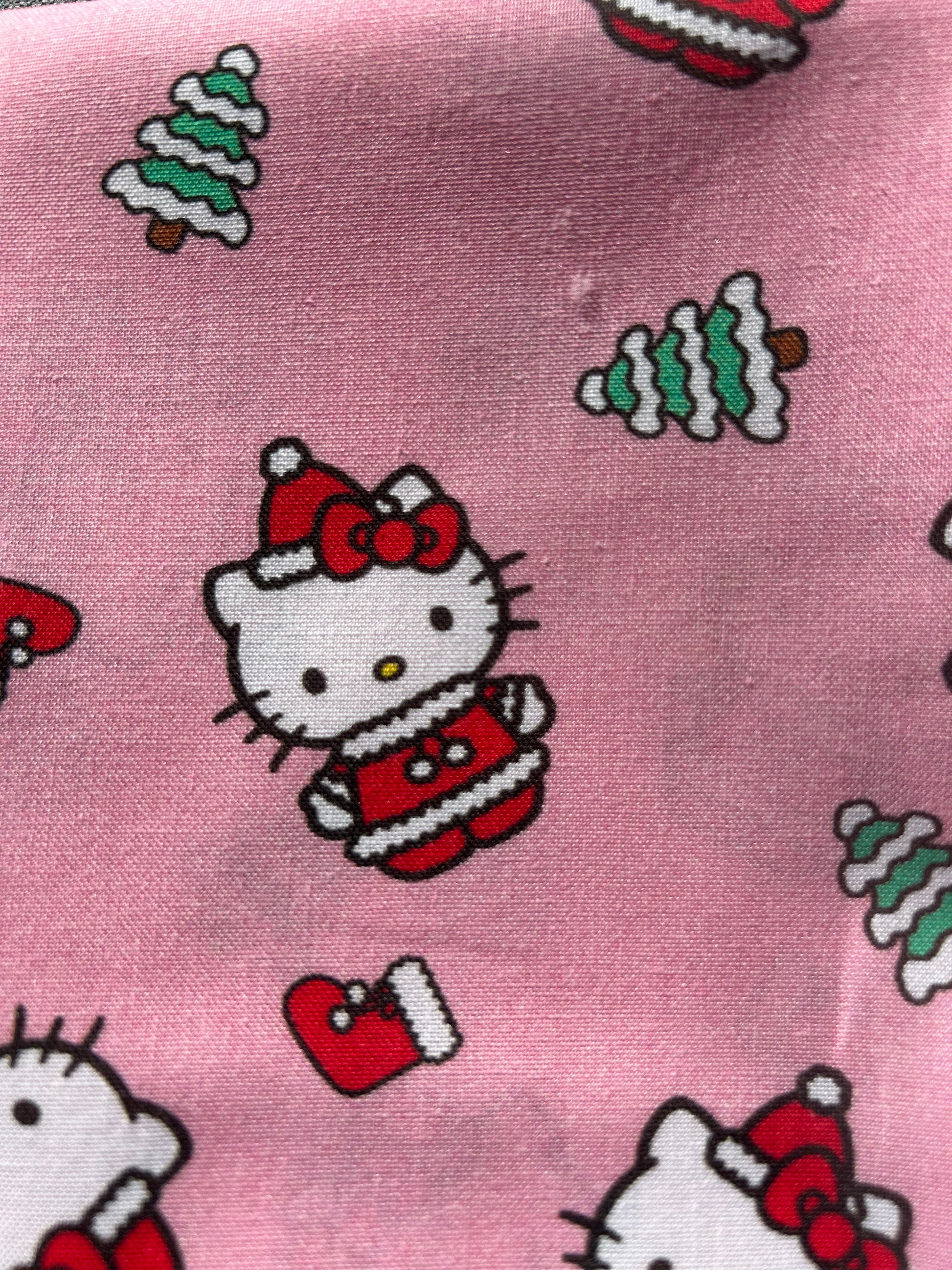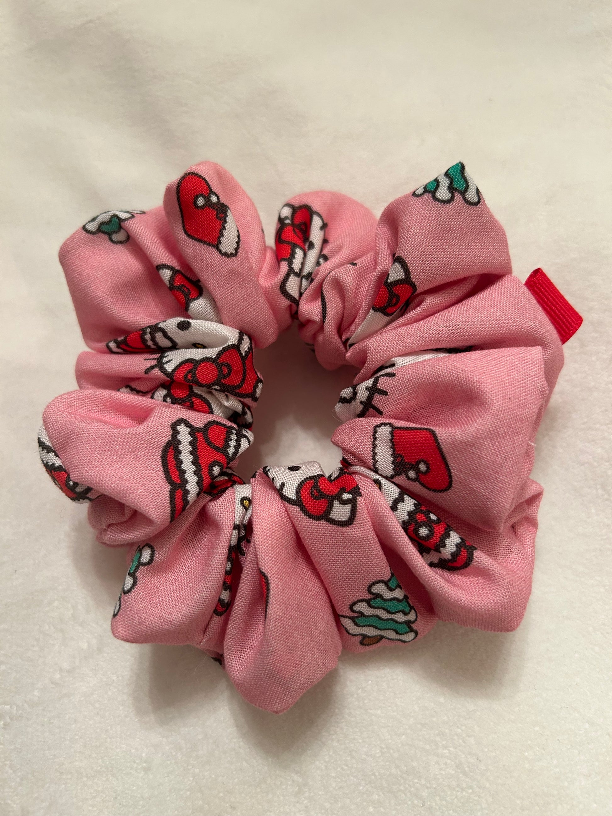 Pink scrunchie with Christmas Hello Kitty print and red ribbed tag.
