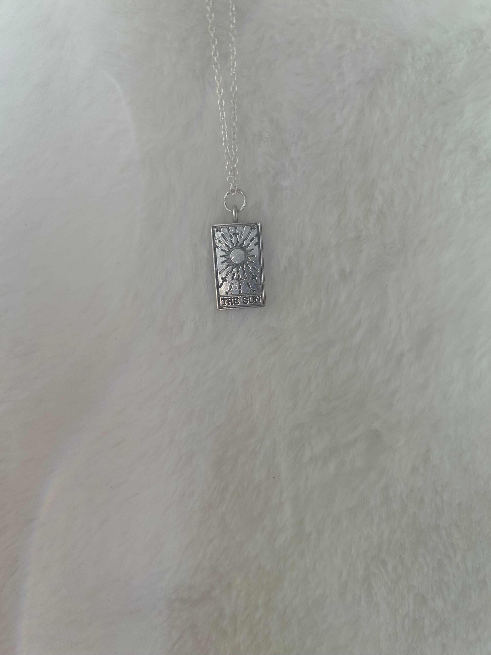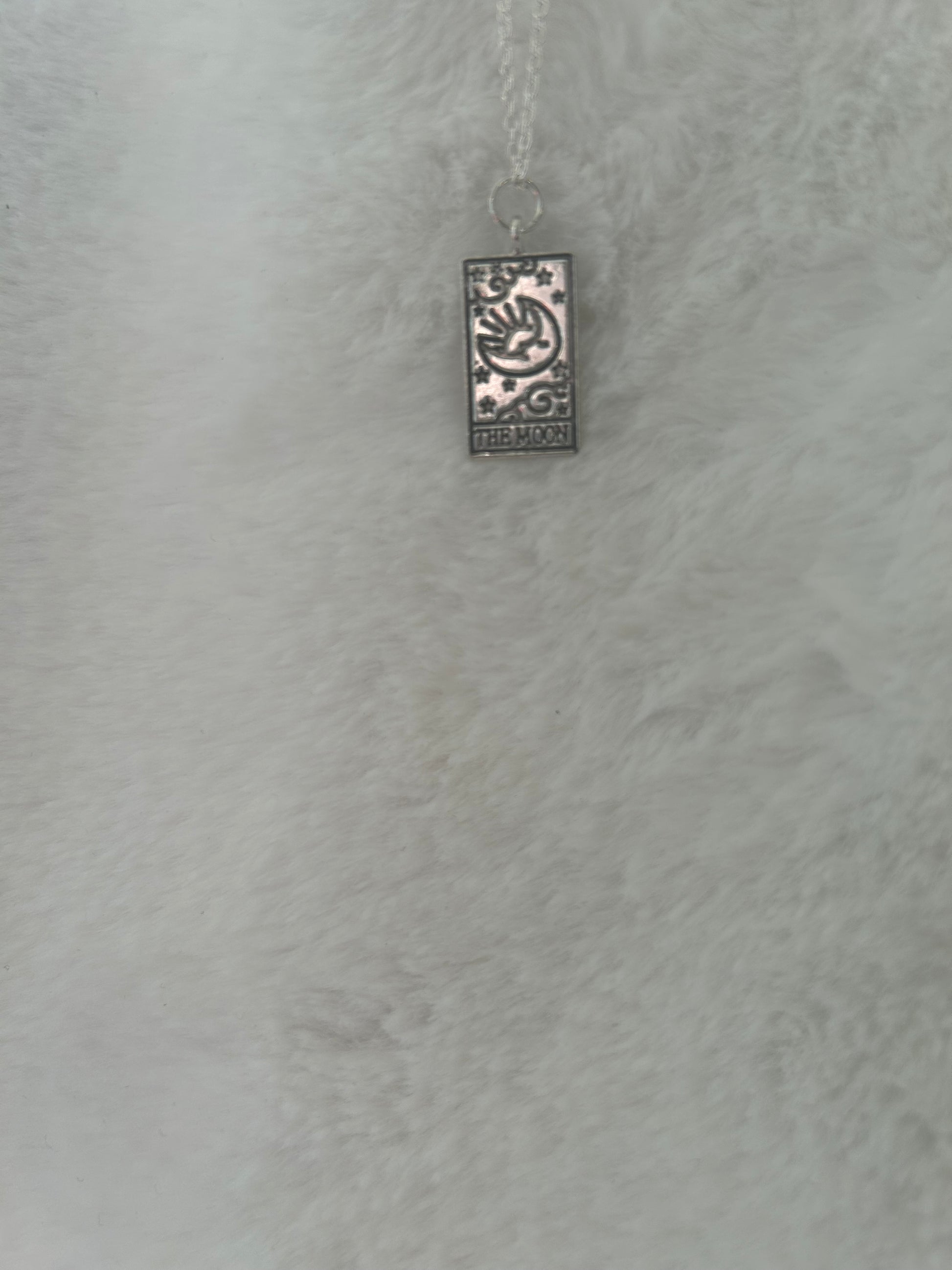 Tarot charm on silver colored chain. The workls tarot charm, the sun tarot charm, the moon tarot charm, the fortune tarot charm, the world or the star tarot charm.