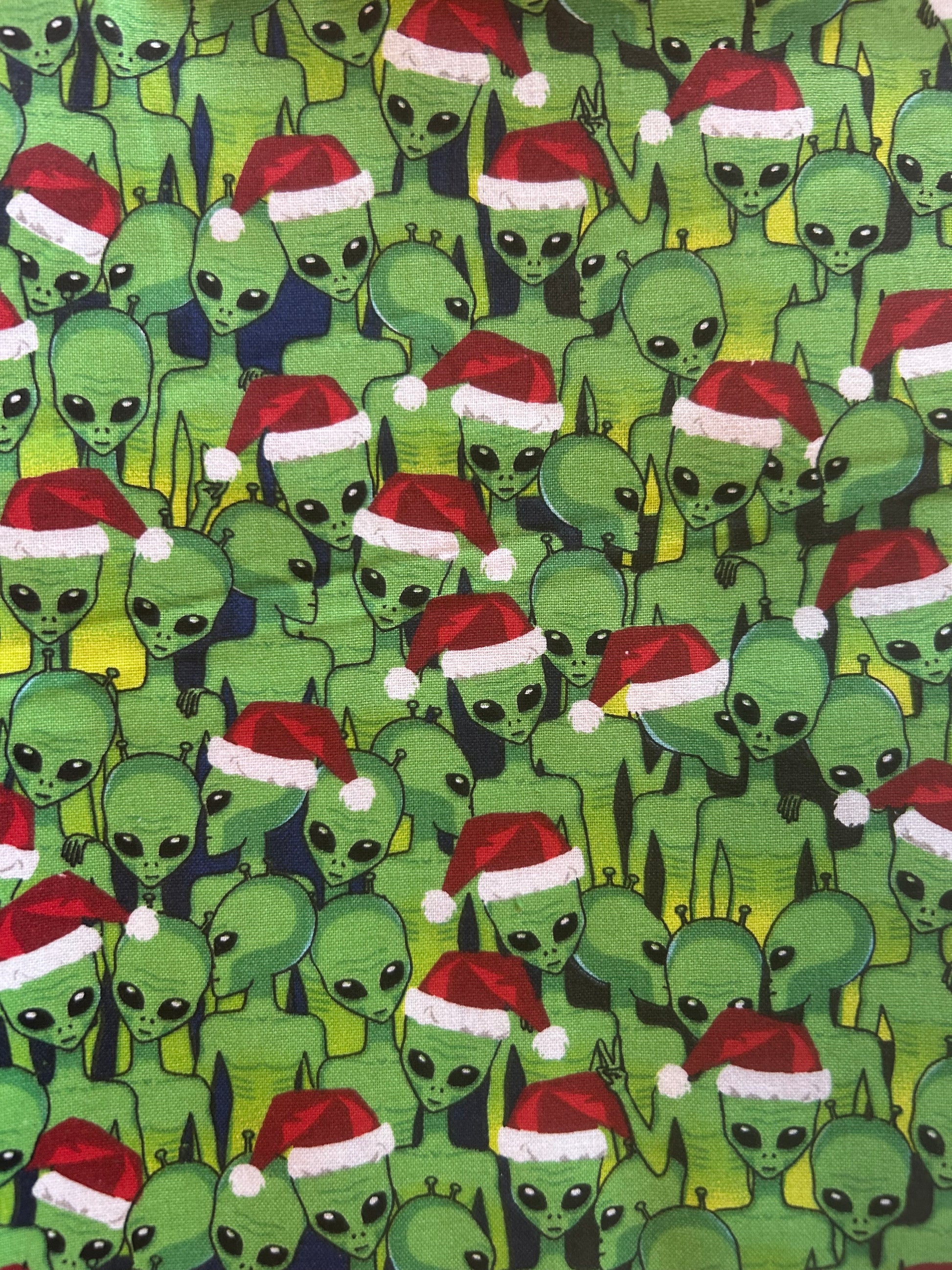 Green alien wearing Santa hat printed scrunchie and red ribbed tag.