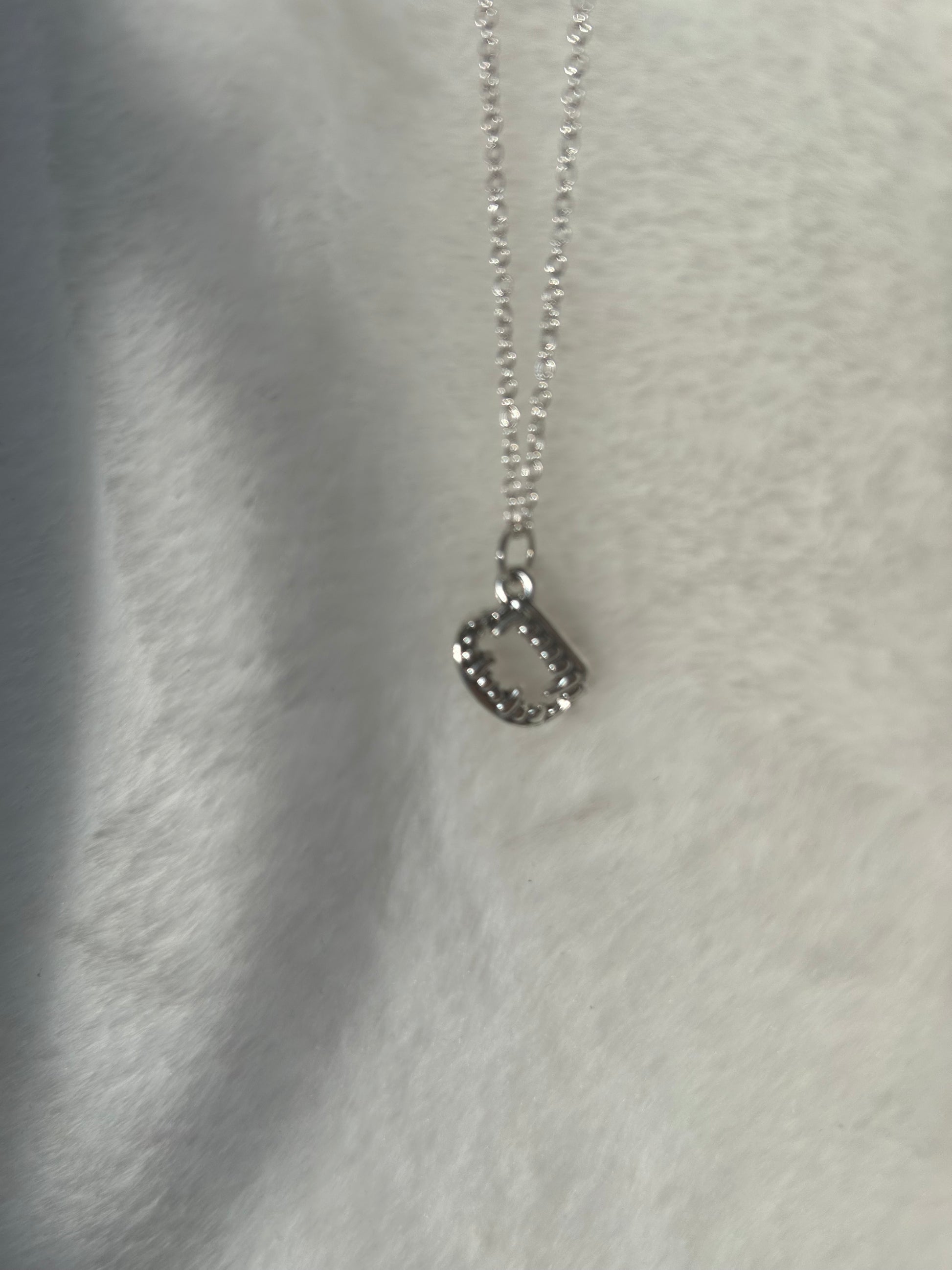 Silver colored vampire teeth charm on silver colored chain.