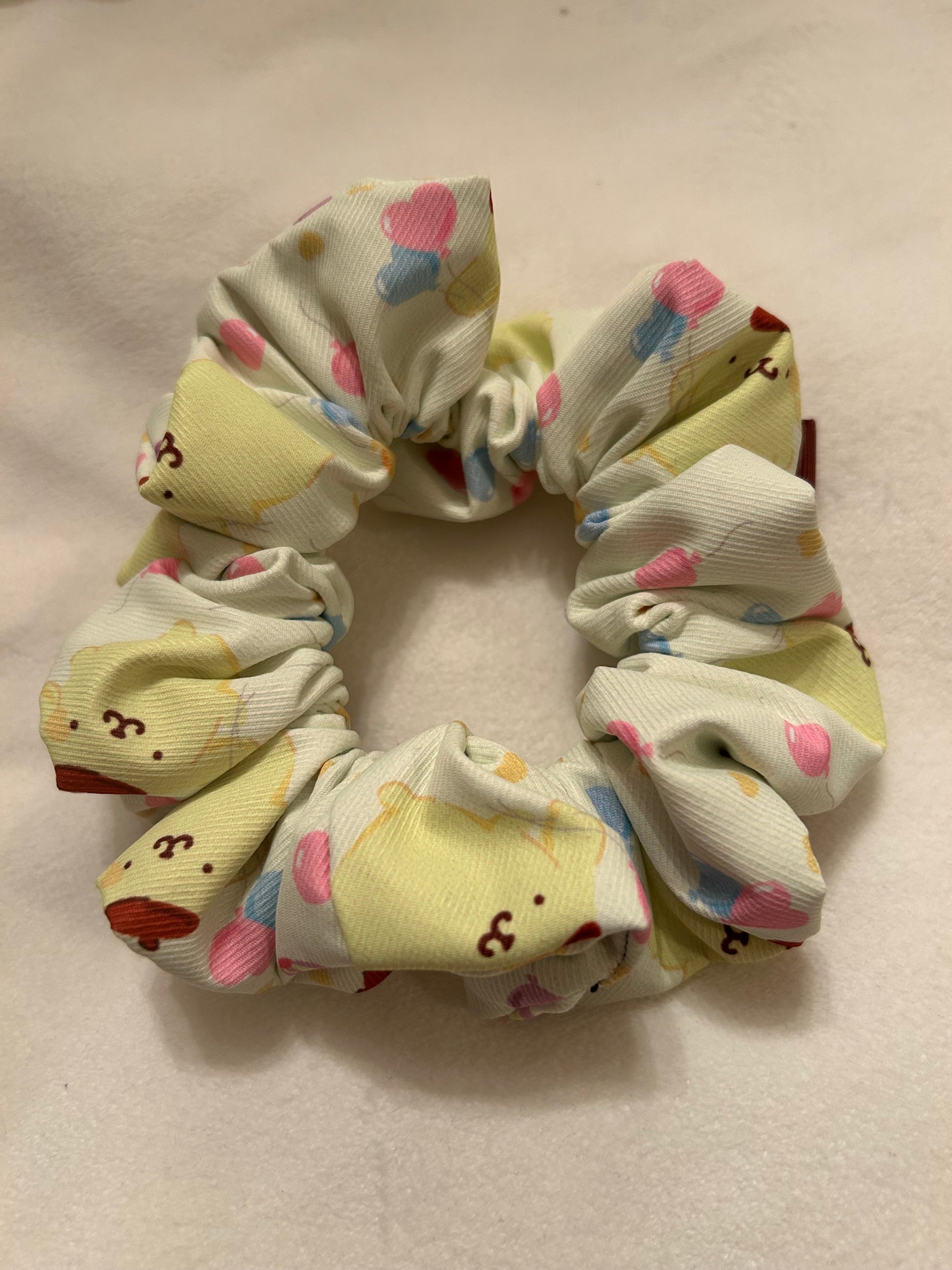 Yellow scrunchie with pompompurin print and brown ribbed tag.
